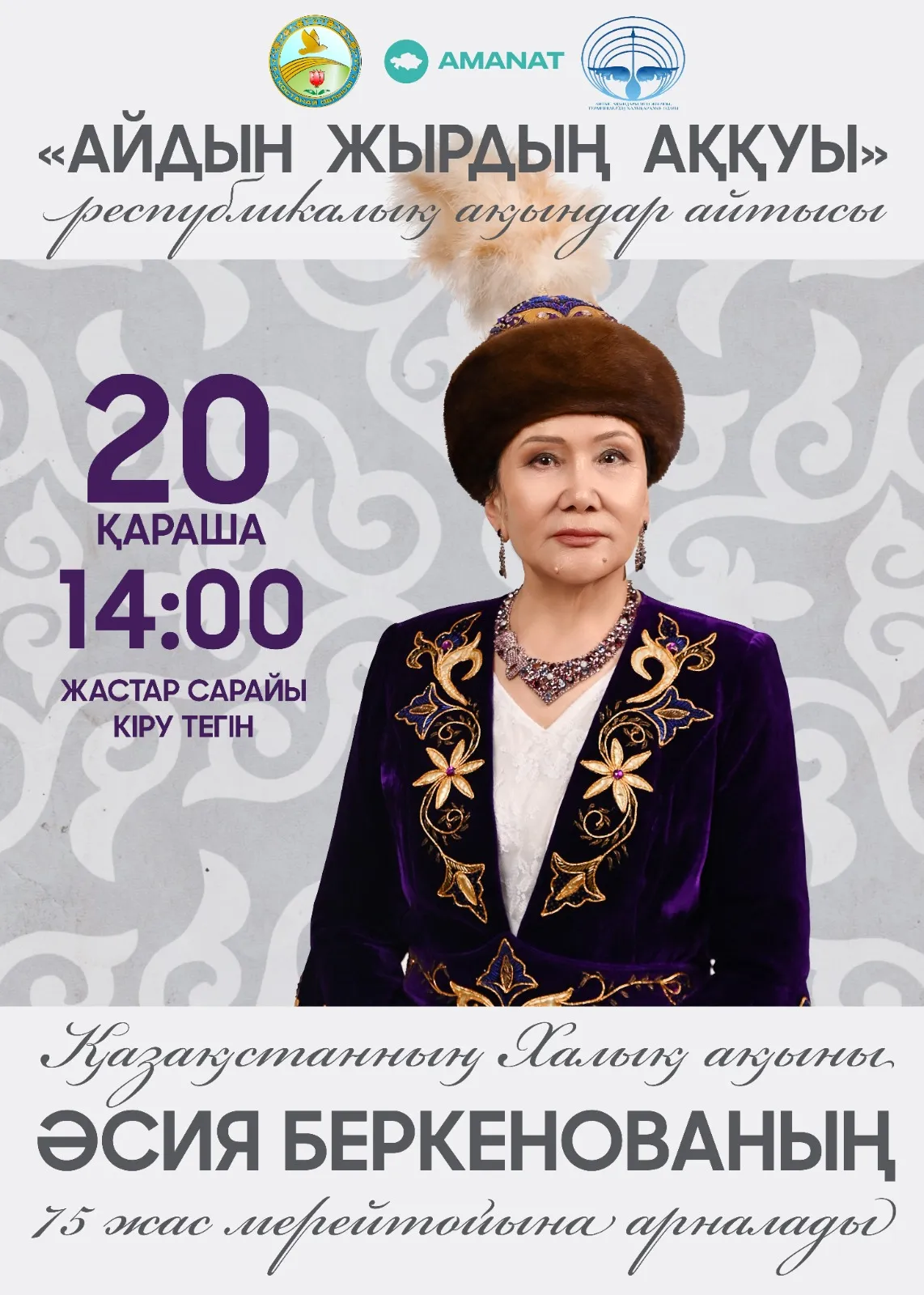 Қазақтың төл өнерін аспандатқан, аққуындай әсем үнімен ел жүрегіне жол салып, төрелігін айтқан Әсия Беркенованың 75 жас мерейтойына арналған республикалық «АЙДЫН ЖЫРДЫҢ АҚҚУЫ» атты жыр додасы өтпек