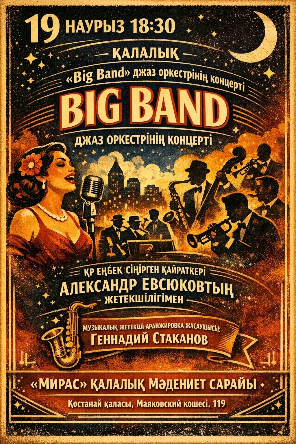 19 наурыз • 18:30 | ҚР еңбек сіңірген қайраткері Александр Евсюковтың жетекшілігімен — қалалық «Big Band» джаз оркестрінің концерті