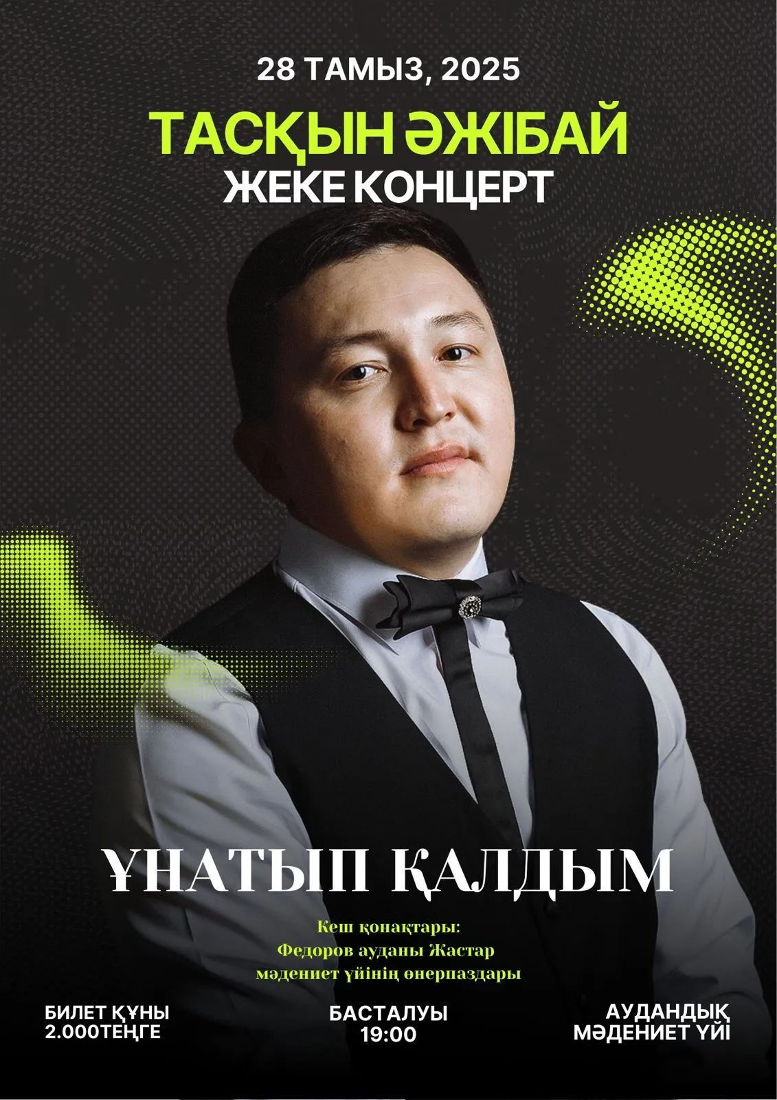 Облыстық, республикалық, халықаралық байқаулардың лауреаты, Қостанай облысы Федоров Жастар АМҮ “Жаркөл” халық театрының жетекшісі, Е.Өмірзақов атындағы филармониясының солисті Әжібай Тасқын Оңғарұлының шығармашылығына арналған «Ұнатып қалдым» атты жеке ән кеші өтеді