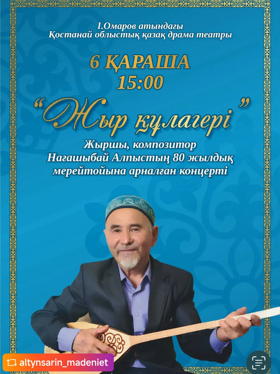 #REPOST @altynsarin_madeniet 🇰🇿 Құрметті қостанайлықтар және қала қонақтары! Сіздерді жыршы, термеші, Қостанай облыстық Композиторлар одағының мүшесі Нағашыбай Алпыстың 80 жылдық мерейтойына арналған концертке шақырамыз!