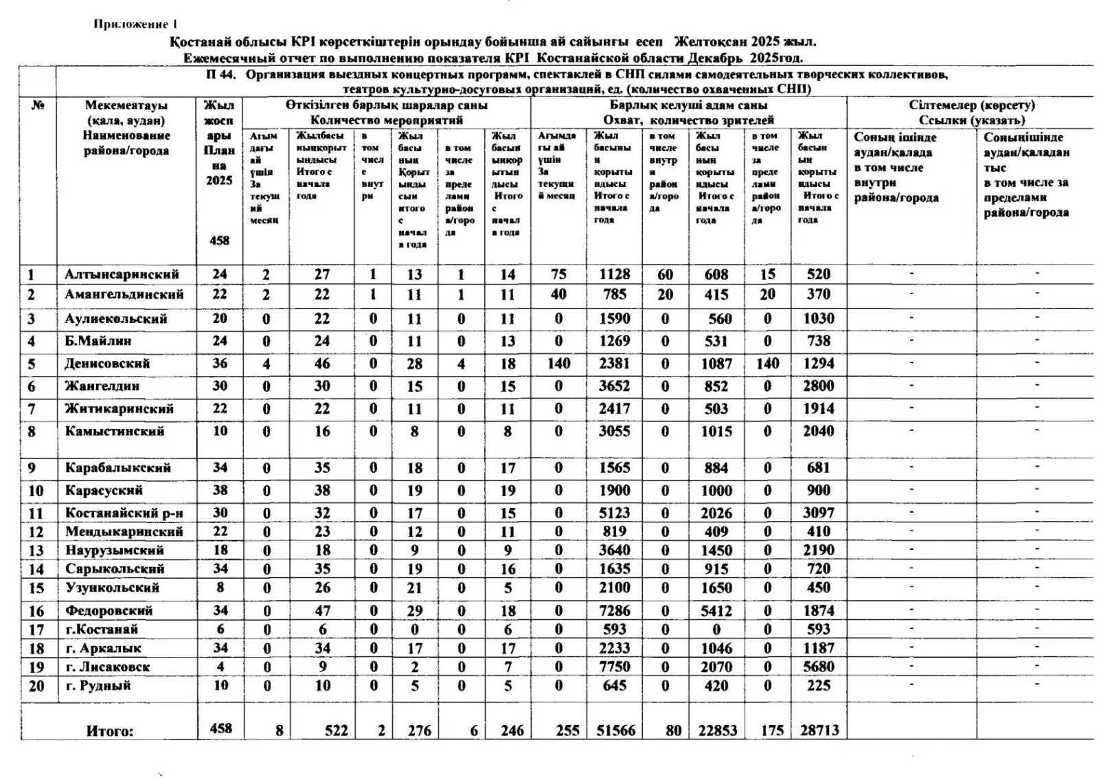 Қостанай облысы КРІ көрсеткіштерін орындау бойынша ай сайынғы есеп | Желтоқсан 2025 жыл.