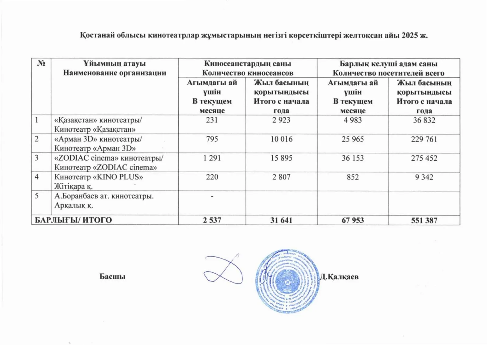 Қостанай облысы кинотеатрлар жұмыстарының негізгі көрсеткіштері желтоқсан айы 2025 ж.