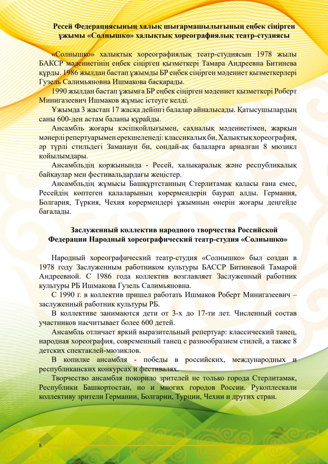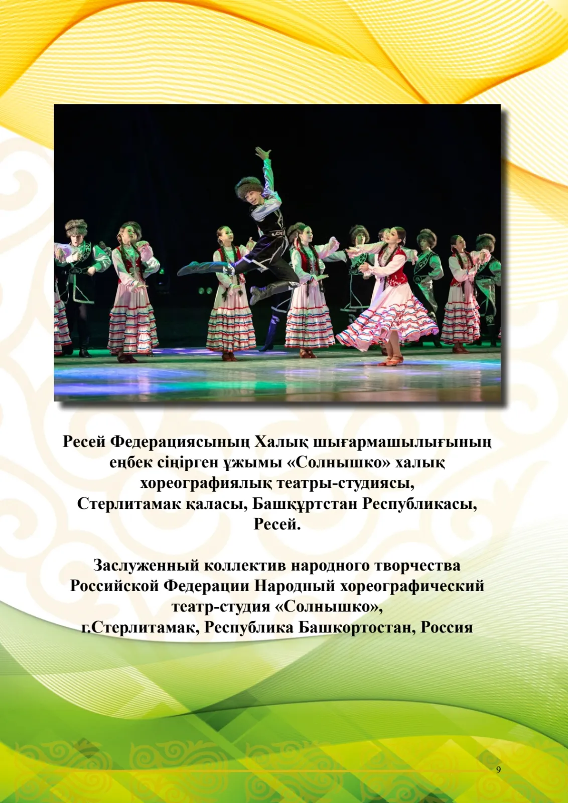Участник VII Международного фестиваля хореографического искусства «Наурыз достарын шақырады»: Заслуженный коллектив народного творчества Российской Федерации Народный хореографический театр-студия «Солнышко», г.Стерлитамак, Республика Башкортостан, Россия