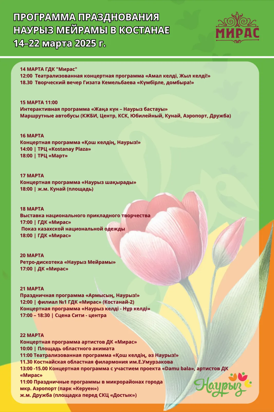 ПРОГРАММА ПРАЗДНОВАНИЯ НАУРЫЗ МЕЙРАМЫ В КОСТАНАЕ 14–22 марта 2025 г.
