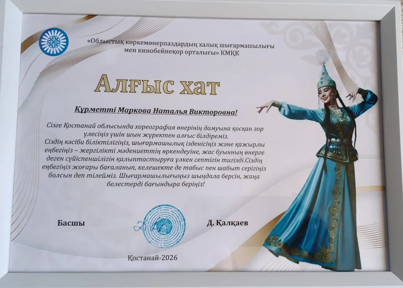 В рамках мастер-класса Наталье Викторовне Марковой было вручено благодарственное письмо за вклад в развитие хореографического искусства в Костанайской области. Эта высокая оценка является признанием профессионализма, творческого подхода и преданности своему делу.