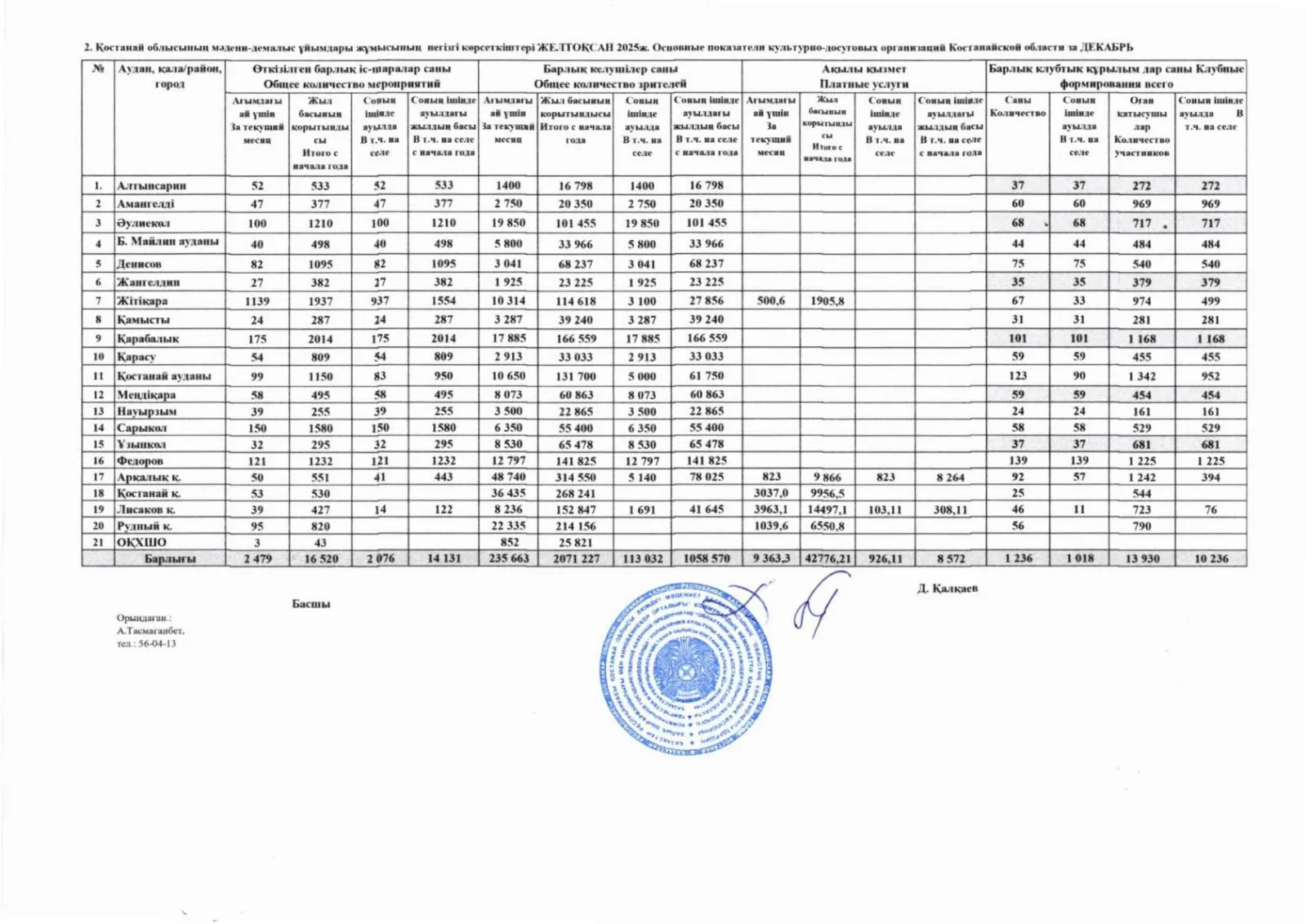 Основные показатели культурно-досуговых организаций Костанайской области за ДЕКАБРЬ 2025г.